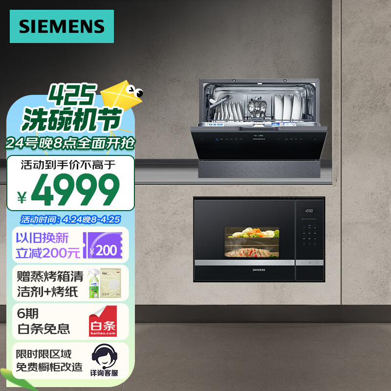 西门子(SIEMENS)洗嵌套装 5套嵌入式台式洗碗机家用 易安装+嵌入式微波炉组合套装 BE525+SK256价格:4999.00元!