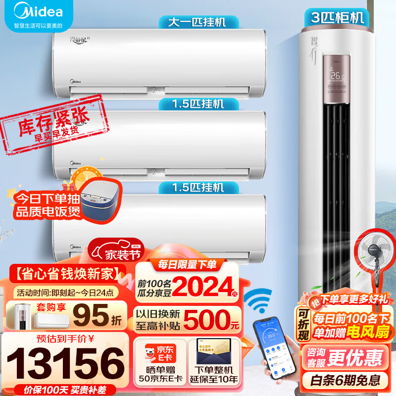 美的(Midea)空调套购 冷静星智行 三室一厅 一级变频冷暖大出风口空调 3匹智行+1.5匹冷静星(2台)+大1匹冷静星价格:13156.00元!