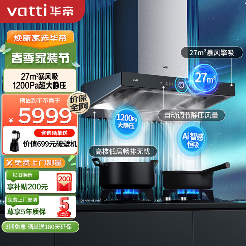 华帝(VATTI)抽油烟机欧式顶吸三腔S19家用变频大吸力烟机燃气灶具烟灶套装27风量自动清洗 i11186套装天然气价格:5999.00元!