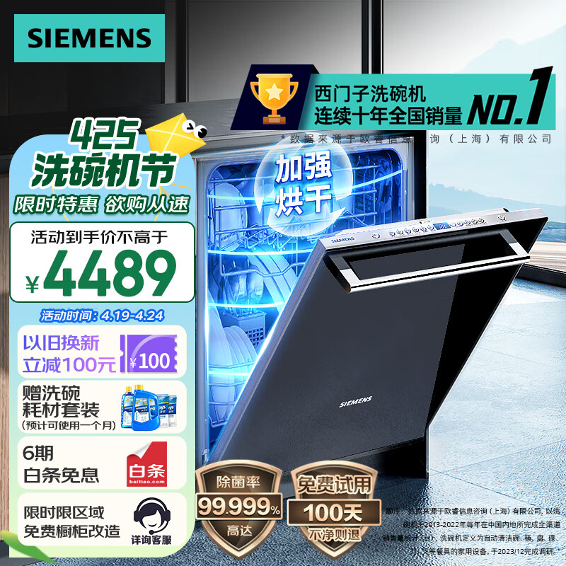 西门子SJ636X04JC(含黑色门板) 12套大容量家用洗碗机嵌入式 智能除菌 变频节能 三重烘干 洗烘一体价格:5099.00元!