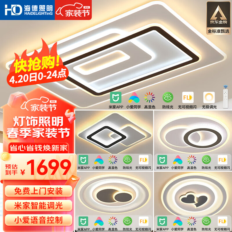 HD米家智能AI语音吸顶灯 led大客厅卧室全屋灯饰 包安装灯具套餐B价格:2299.00元!