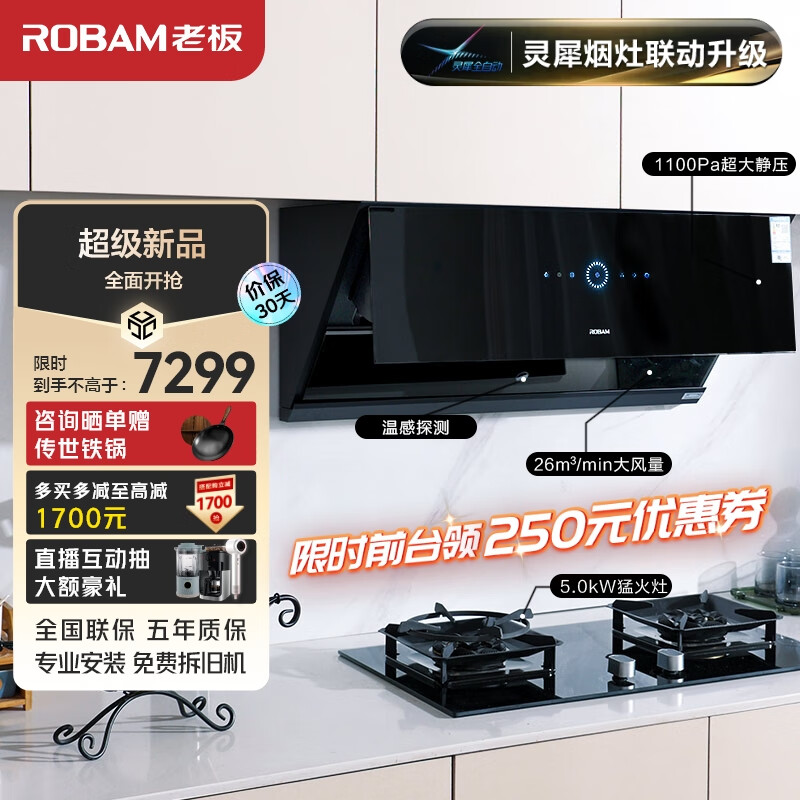 老板(Robam)抽油烟机智能变频灵犀全自动控烟家用侧吸26风量吸烟机燃气灶具烟灶套装29A9S+57B6D套装(液化气)价格:7299.00元!