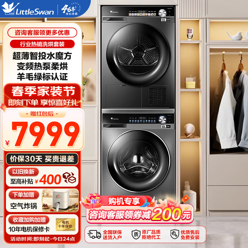 小天鹅(LittleSwan)洗烘套装 超薄水魔方智能投放滚筒洗衣机 10公斤变频热泵烘干衣机SC18+HS81MAX价格:8199.00元!