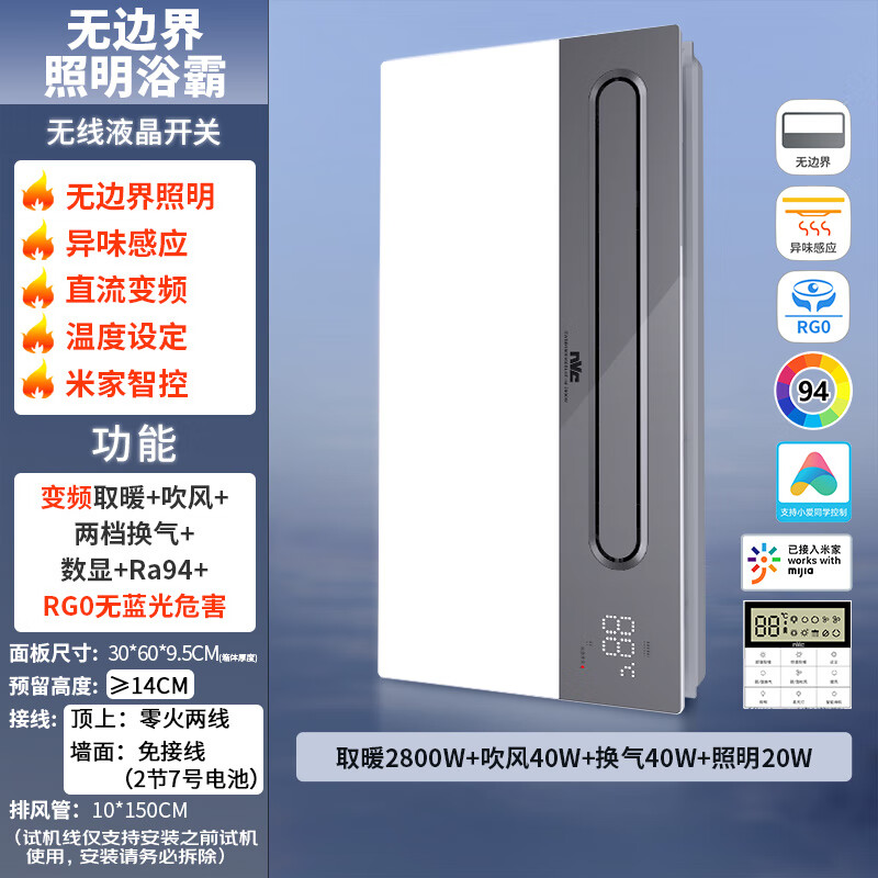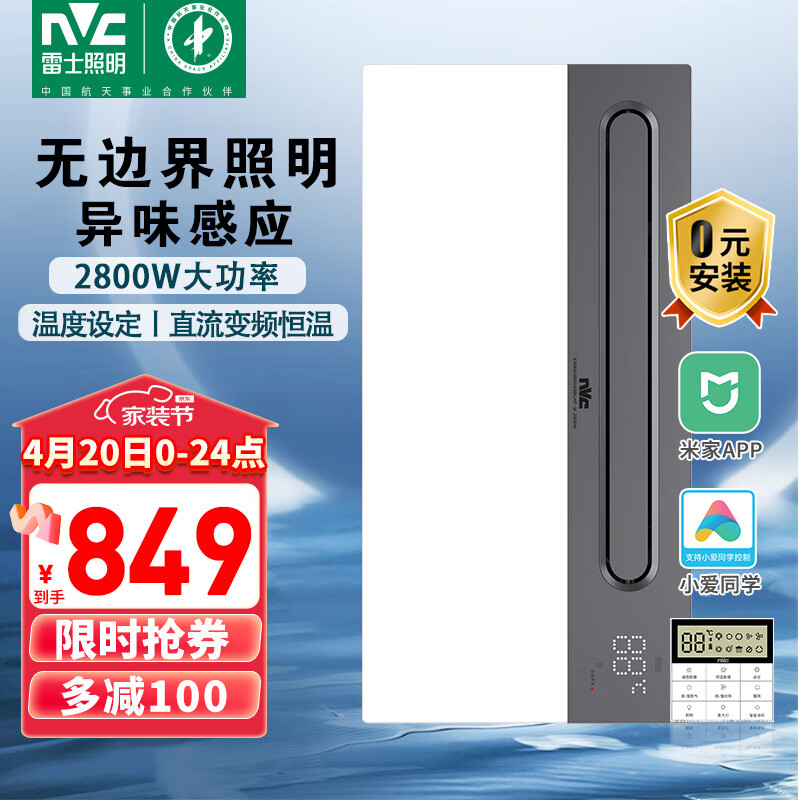 雷士(NVC)米家智能无边界除菌浴霸暖风照明排气一体机卫生间浴室集吊Y332价格:1149.00元!