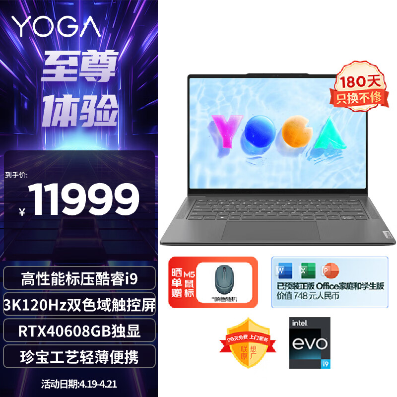 联想笔记本电脑YOGA Pro14s版 高性能标压酷睿i9 14.5英寸轻薄本32G 1T RTX4060 3K高刷触控屏商务价格:11999.00元!