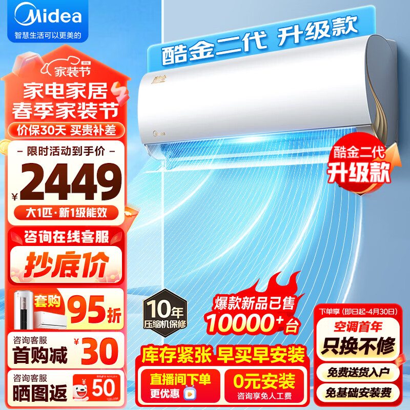 美的(Midea)空调大1匹挂机 酷金二代升级版 新一级能效 节能省电 壁挂式 卧室书房智能空调 KFR-26GW/N8ZHA1Ⅱ价格:2449.00元!