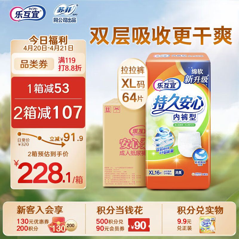 乐互宜持久安心成人拉拉裤老年人长效吸收加大加厚尿不湿XL码64片价格:320.00元!