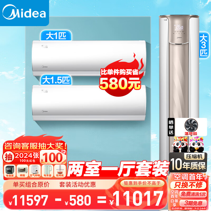 美的(Midea)空调套装两室一厅套餐一套购齐 新一级能效变频挂机柜机 3匹锐静+风酷/极酷/冷静星/酷省电/青春价格:11017.00元!