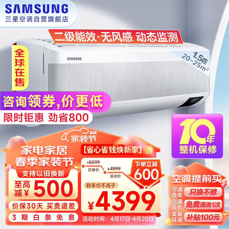三星空调1.5匹新二级能效全直流变频无风感WIFI除菌冷暖壁挂式挂机20-25㎡适用以旧换新AR12TSCAAWKNSC价格:4999.00元!