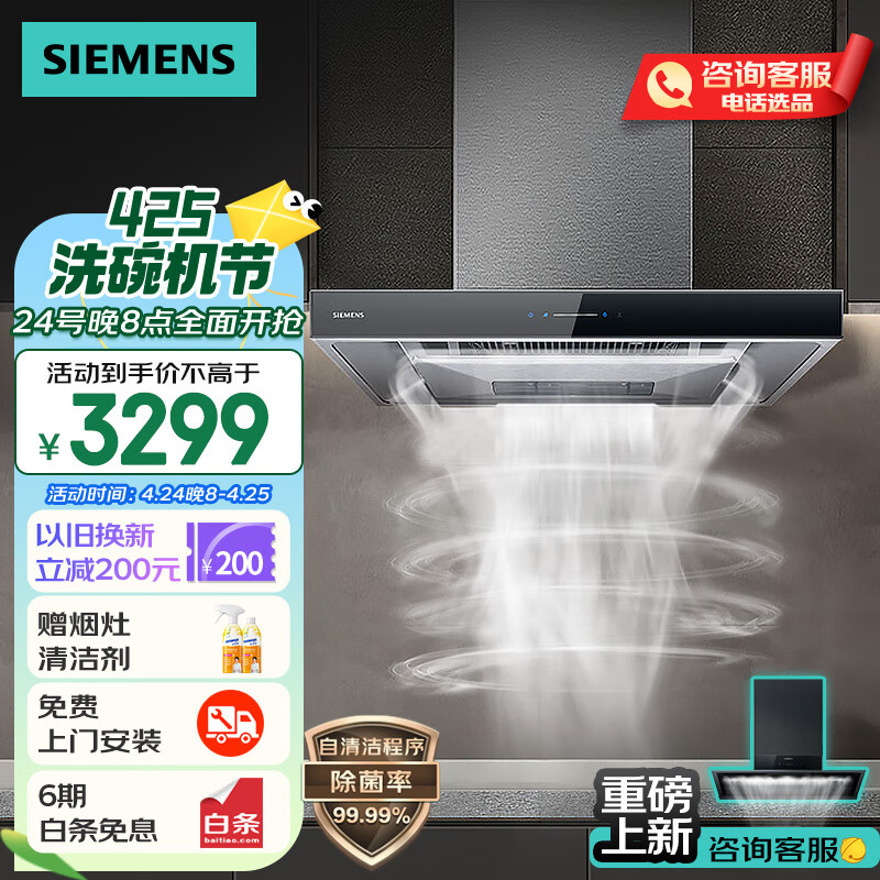西门子(SIEMENS)欧式抽油烟机21.5m3/min顶吸家用吸抽烟机 5D立体环吸自清洁LC77UA951W以旧换新价格:3299.00元!