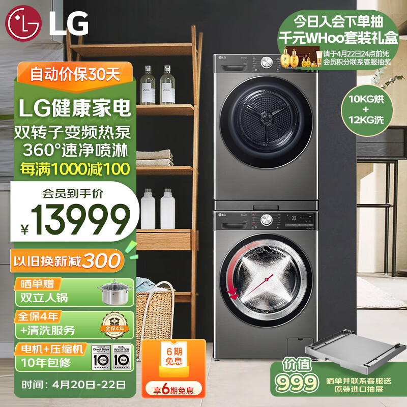 LG小旋风MAX洗烘套装 12kg滚筒洗衣机+10kg双变频热泵烘干机 洗净比1.1 FCW12Y4PA+RH10V9PV2WR 银价格:14999.00元!