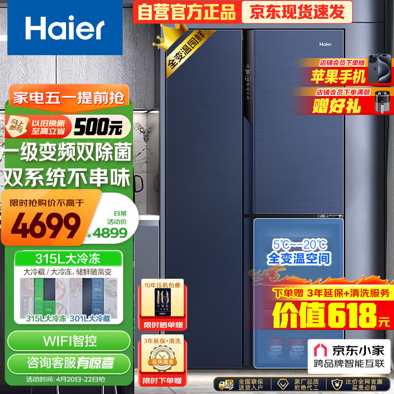 海尔(Haier)501升双系统双循环侧T型双门三开门电冰箱家用一级能效变频节能无霜超薄嵌入式BCD-501WLHTS79B9U1价格:4699.00元!