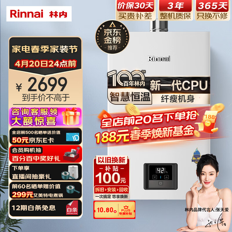 林内(Rinnai)【小蛮腰】13升燃气热水器 智慧恒温 全新升级CPU 黄金窄比 恒温系列RUS-13GD31(JSQ26-GD31)价格:2699.00元!