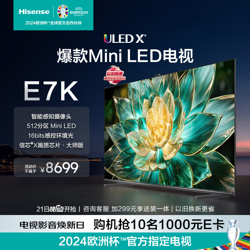 海信电视85E7K 85英寸 ULED X Mini LED 512分区 AI摄像头超感知 智慧屏 液晶智能平板电视机 以旧换新价格:8699.00元!