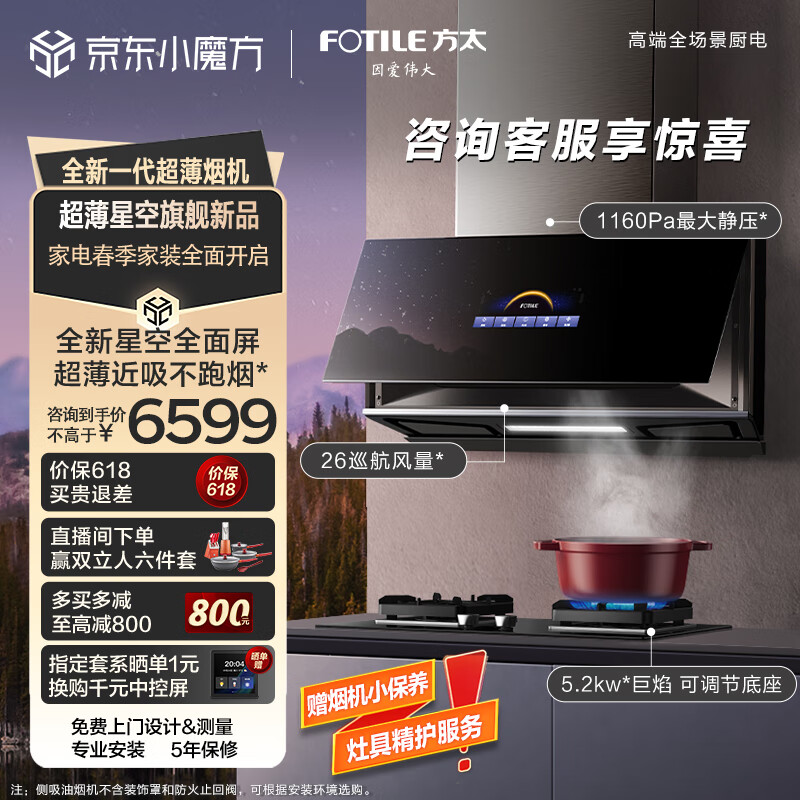 方太抽吸油烟机灶具套装 侧吸式变频烟灶 26大风量 超薄近吸 5.2kW燃气猛火双灶 P10.i+02-TH27B价格:6599.00元!