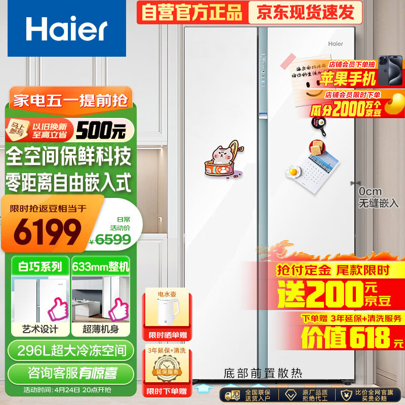 海尔(Haier)白巧系列561L全空间保鲜大冷冻电冰箱家用一级能效变频对开双开门超薄零嵌入式BCD-561WLHSS14W9U1价格:6399.00元!