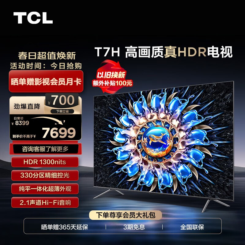 TCL电视 85T7H 85英寸 HDR 1300nits 330分区 4K 144Hz 2.1声道音响 客厅液晶智能平板游戏电视机价格:7499.00元!
