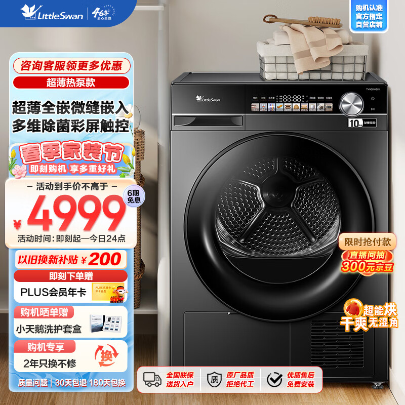 小天鹅(LittleSwan)10公斤热泵烘干机家用 全自动干衣机 超薄全嵌-纤彩 除菌除螨除潮 TH100HS81【小乌梅轻享版】价格:4999.00元!