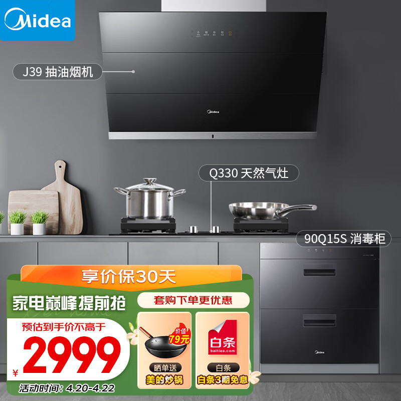 美的(Midea)烟灶消三件套侧吸智能干洗抽油烟机5.0KW火力燃气灶100L消毒柜J39+Q330+90Q15S(天然气)价格:2999.00元!