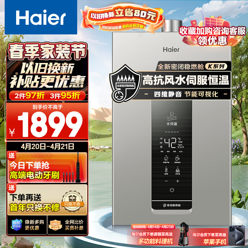 海尔(Haier)13升【K系列KL3】燃气热水器天然气 水伺服恒温 一级静音 全新密闭稳燃舱高楼层适用JSQ25-13KL3U1价格:1899.00元!