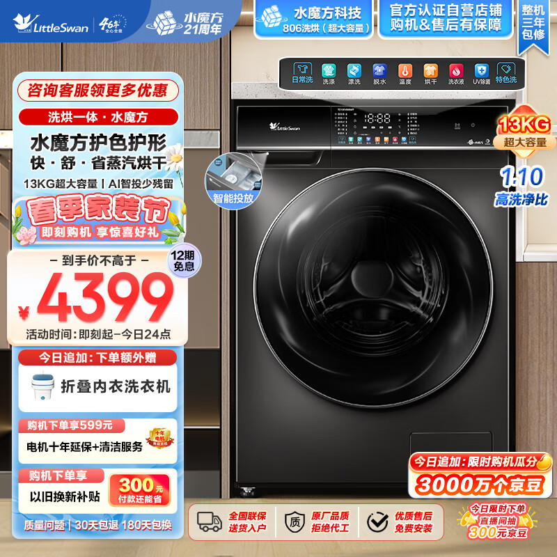 小天鹅(LittleSwan)滚筒洗衣机全自动 水魔方【TD130V806MIT】洗烘一体 冷水洗 1.1洗净比 彩屏智投放 超大容量13公斤价格:4399.00元!
