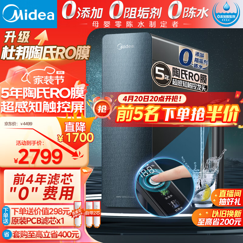 美的净水器家用净水机星河1000G PRO 5年长效陶氏RO反渗透净水器厨下式直饮机 鲜活零陈水智能触控屏价格:2799.00元!