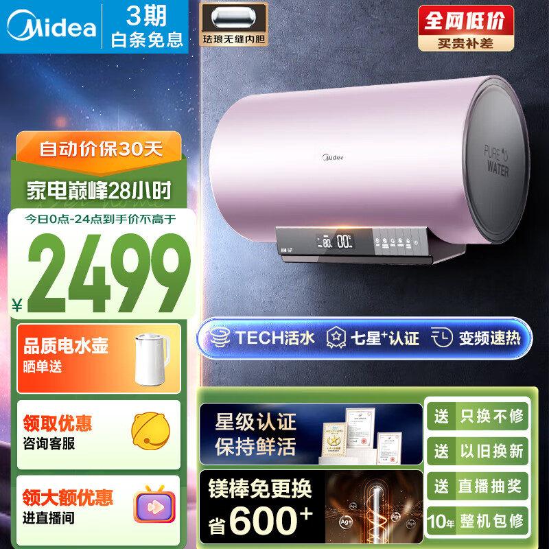 美的(Midea)TECH活水系列电热水器60升免换镁棒 3300W变频速热净肤洗智能八重净滤F6033-HQ3(HE)凝霜芋价格:2699.00元!