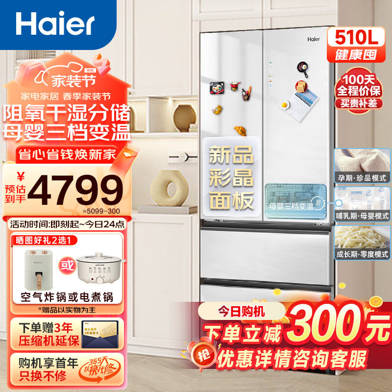 海尔(Haier)510升大容量法式多门四开门家用电冰箱 全新彩晶面板 超薄嵌入式 变频无霜三档变温净味价格:4699.00元!