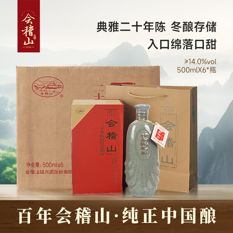 会稽山 典雅二十年 传统型半干 绍兴 黄酒 500ml*6瓶 整箱装 花雕价格:1668.00元!