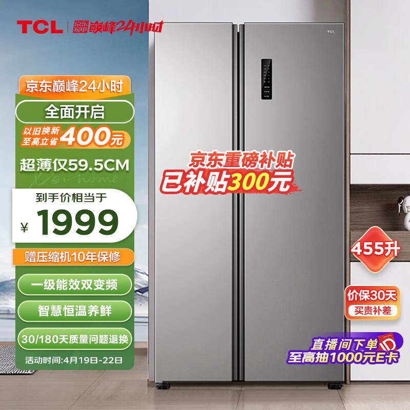 TCL455升V3超薄大容量养鲜对开门双开门冰箱 电脑温控一级能效一体双变频风冷无霜家用电冰箱R455V3-S价格:1999.00元!