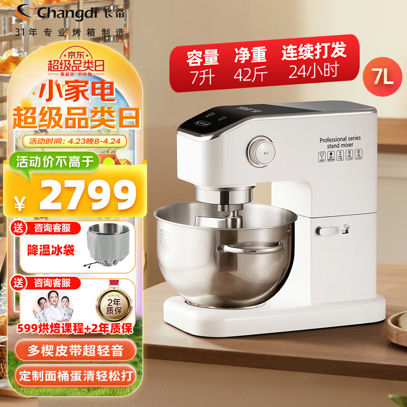 长帝家商用厨师机 7L大容量 顶部触控 直流电机金属机身 稳固低噪 搅面机面条机和面机揉面机 海牛顶顶价格:2849.00元!