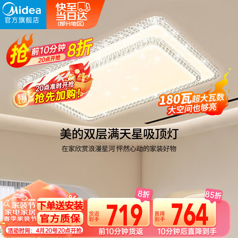 美的(Midea)LED吸顶灯客厅超大瓦数双层满天星轻奢卧室餐厅180瓦调光灯具灯饰价格:899.00元!