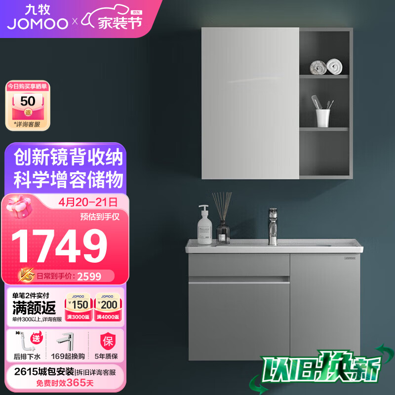 九牧(JOMOO)现代极简浴室柜陶瓷一体盆洗脸盆大收纳柜组合80cm A2715-14HU-5价格:2099.00元!