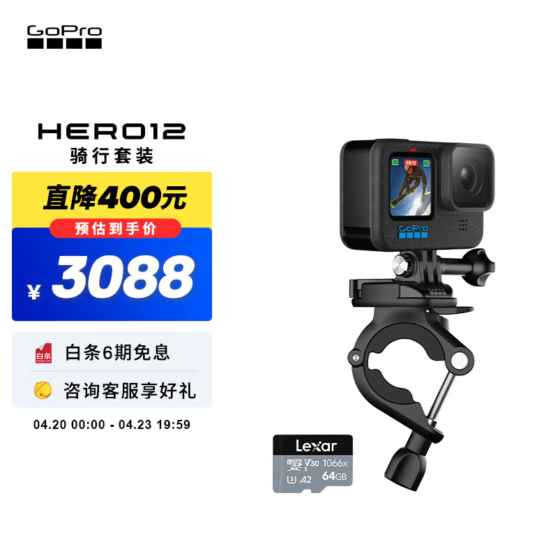 GoPro HERO12 Black运动相机 户外潜水滑雪防抖相机 防水vlog照相机 户外骑行套装【手把固定座+64G卡】价格:3088.00元!