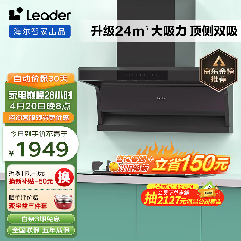 Leader海尔智家出品 顶侧双吸7字型抽油烟机套装 24m3/min大吸力 挥手智控 4.5KW大火力IQ92D+GL2D天价格:1949.00元!