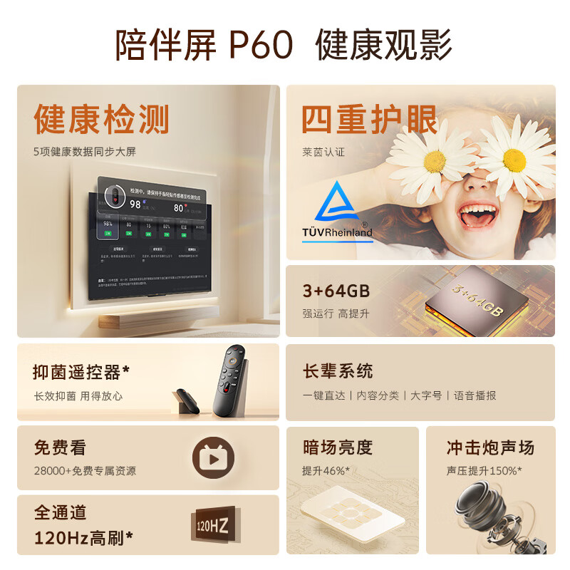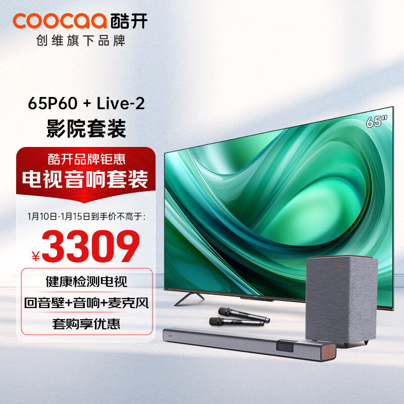 酷开创维 65英寸P60健康检测电视机+Live-2音响 独立低音炮 回音壁 麦克风客厅家庭影院级娱乐体验套装价格:3309.00元!