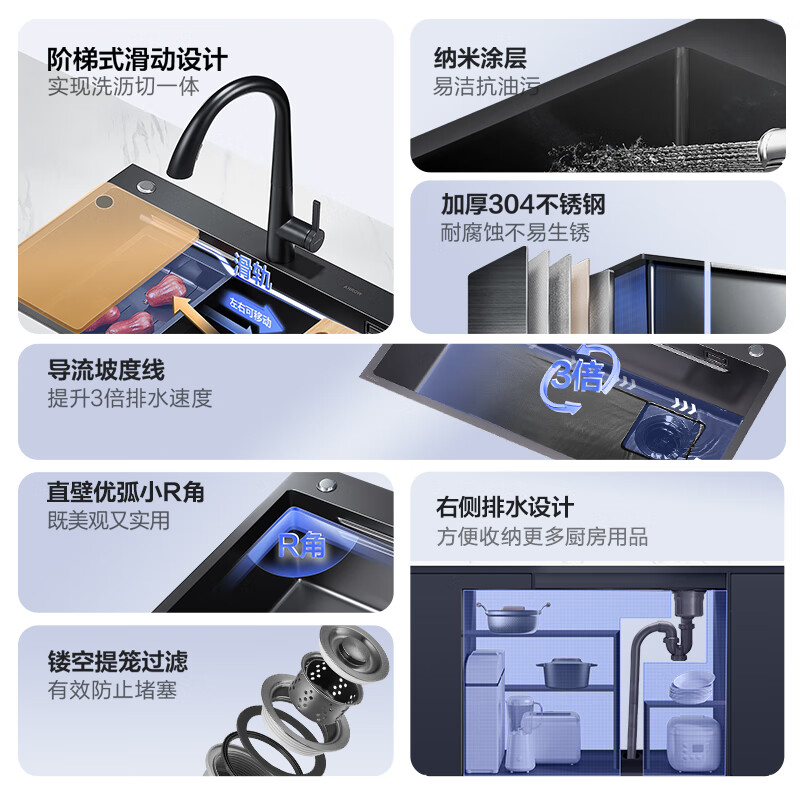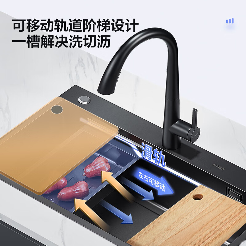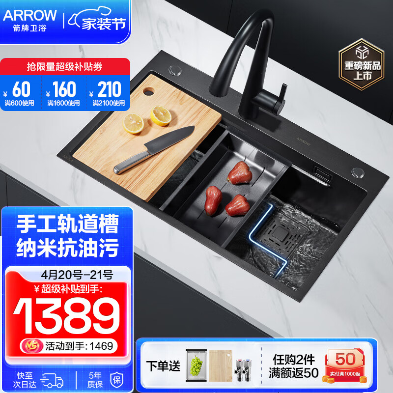 箭牌(ARROW)304不锈钢水槽手工纳米轨道大单槽厨房洗菜盆洗菜池洗碗一体盆 75黑手工纳米轨道槽-含抽拉龙头价格:1769.00元!