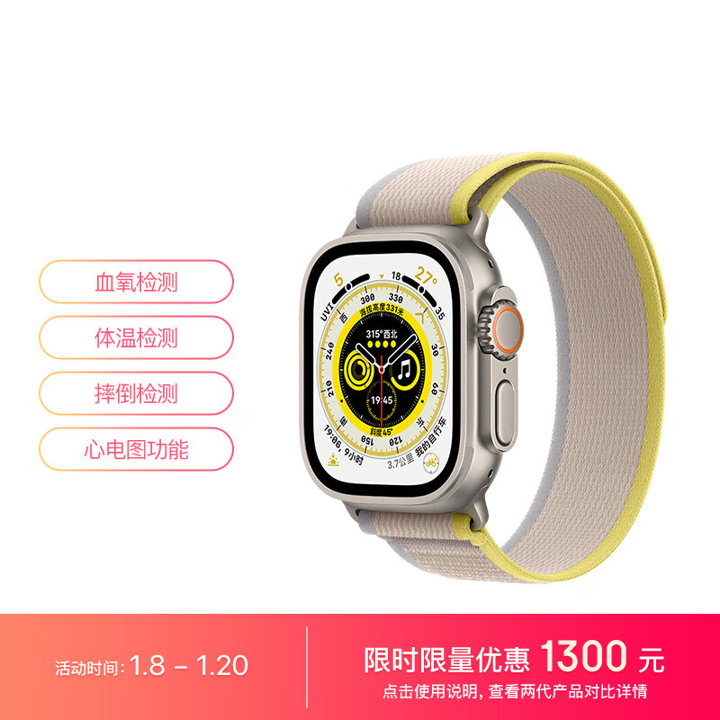 Apple/苹果 Watch Ultra 智能手表GPS+蜂窝款 49毫米钛金属表壳黄配米色野径回环式表带M/L eSIM健康手表MQFE3CH/A价格:4999.00元!