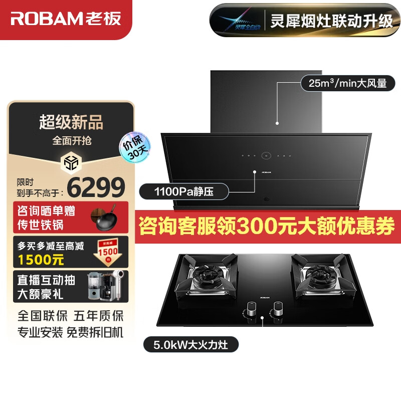 老板(Robam)灵犀全自动侧吸油烟机25大吸力变频抽油烟机家用燃气灶具烟灶套装29X8S+57B2D(天然气)价格:6299.00元!