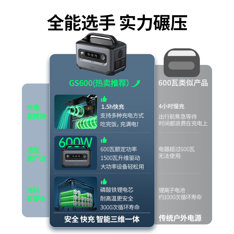 绿联(UGREEN)【磷酸铁锂】户外电源GS600W大功率 680Wh大容量停电应急备用电源 220V快充移动储能 自驾露营电池价格:1499.00元!
