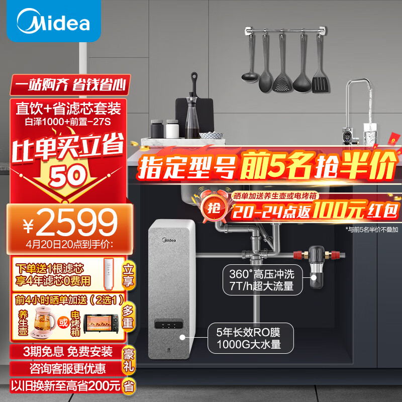 美的(Midea)省芯直饮净水器套装【白泽1000+前置过滤器-27s】厨下式双出水龙头 RO反渗透家用一体净饮机价格:2599.00元!