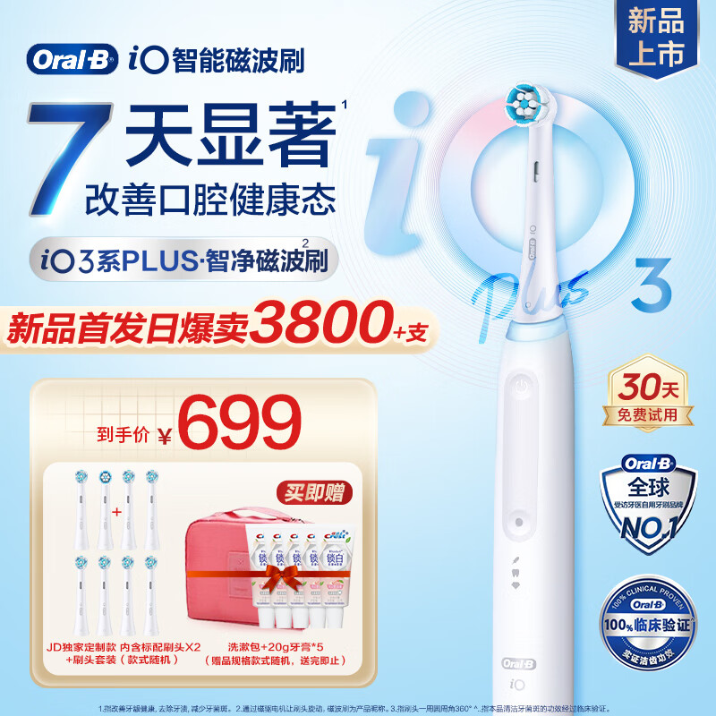 欧乐B成人电动牙刷iO3 plus智净磁波刷 刷头*2 iO系列博朗技术深度自动清洁送男生送新人新婚礼物价格:699.00元!