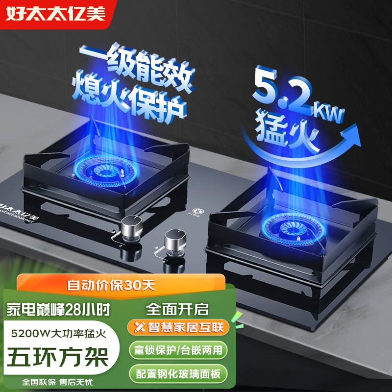 好太太亿美天然气燃气灶双灶家用煤气灶5.2KW猛火台式嵌入式猛火炉具玻璃方架五环灶JZT-K05T价格:297.87元!
