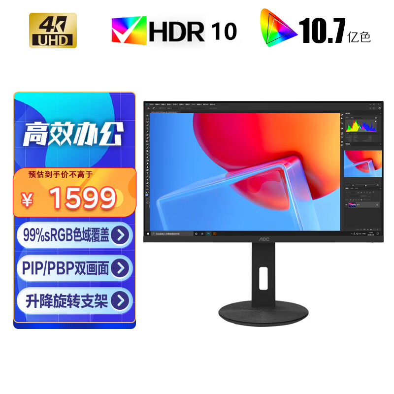 AOC 31.5英寸 4K高清 广色域 10Bit HDR10 低蓝光不闪 出厂校准 双向旋转升降 节能办公电脑显示器 U32N10价格:1599.00元!