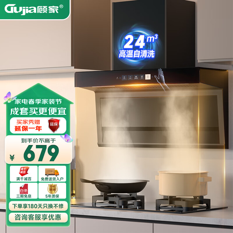 顾家(Gujia)顶侧双吸抽油烟机燃气灶烟灶套装家用厨房大吸力脱排式7字吸油烟机灶具套装 旗舰推荐单机丨24立方+挥手智控价格:679.00元!