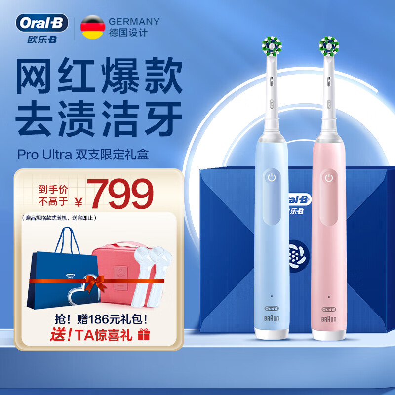欧乐B成人电动牙刷Pro4Ultra双支甄选礼盒Pro系列3D声波圆头深度清洁牙龈按摩送男友送女友母亲节礼物价格:879.00元!