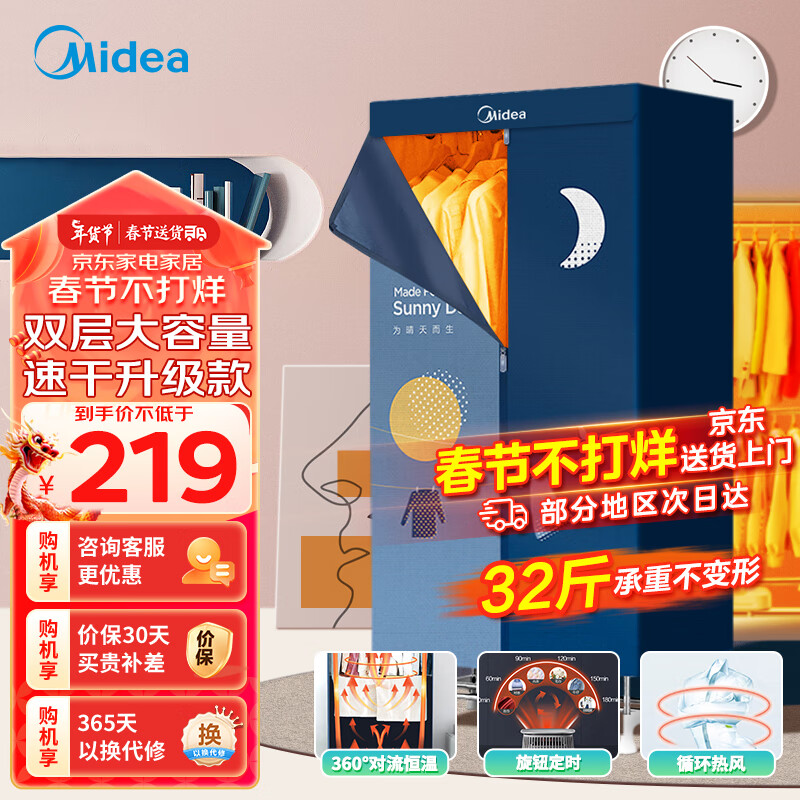 美的(Midea)干衣机烘干机家用布罩类小型烘衣机 婴儿衣物内衣内裤定时暖风机 32斤双层大容量护理机HBG-JQ2价格:243.00元!
