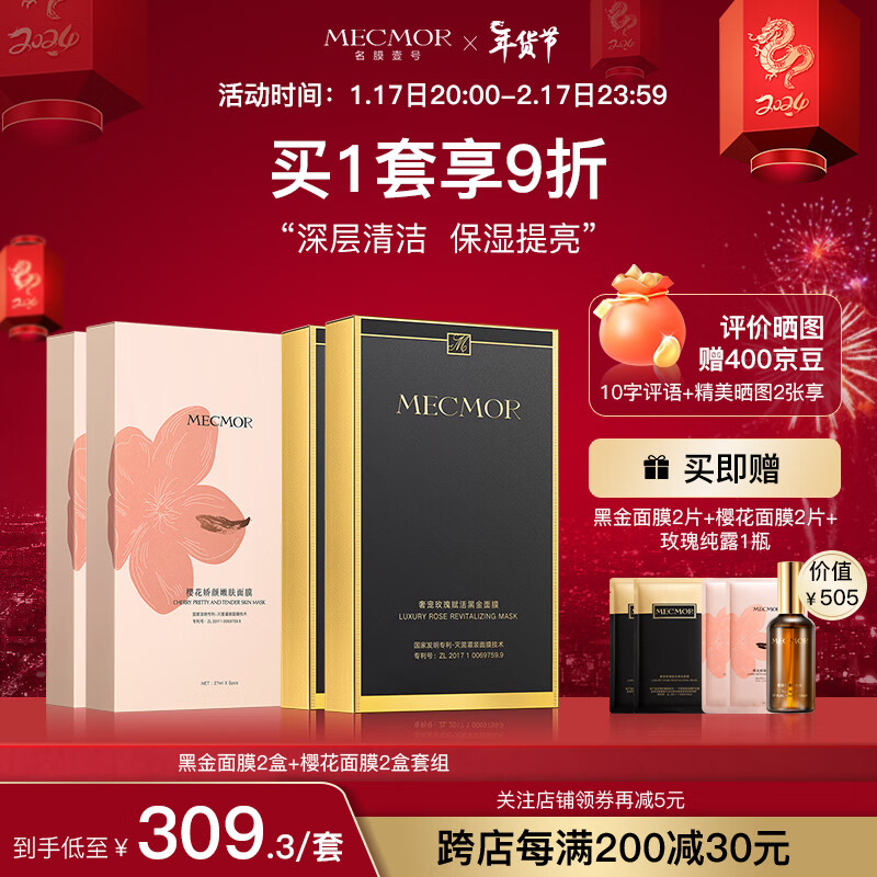 名膜壹号(mecmor)黑金面膜清洁提亮樱花面膜亮肤控油收缩紧致毛孔平细纹男女4盒装价格:377.00元!