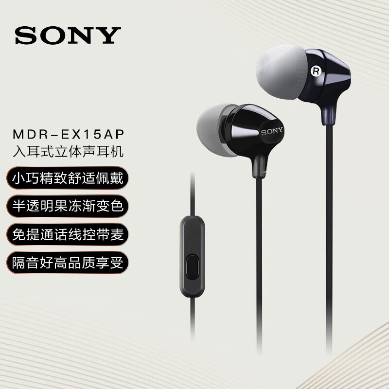 索尼(SONY) MDR-EX15AP 入耳式耳机有线 3.5mm接口 带麦手机通话高音质耳机 黑色价格:109.00元!
