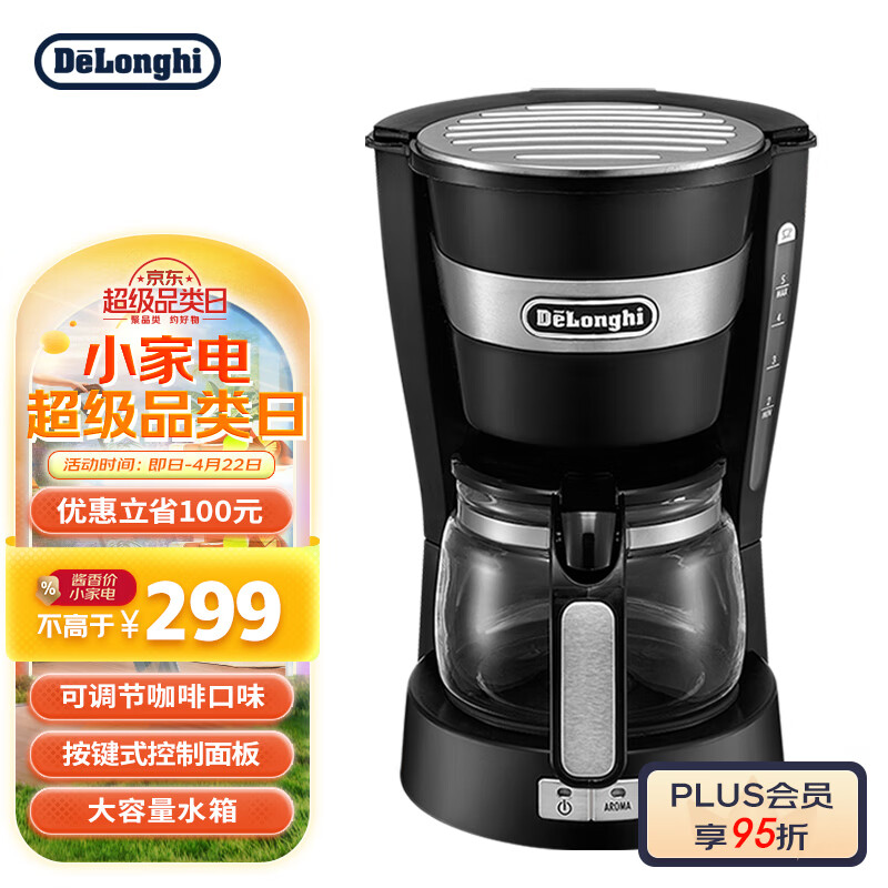 德龙(Delonghi)咖啡机 美式滴漏式咖啡壶 家用迷你半自动咖啡机 ICM14011(黑色)价格:299.00元!